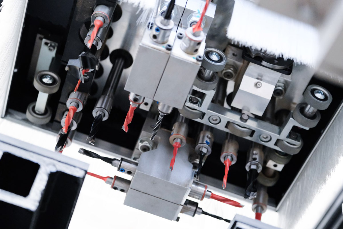 Обеспечивает сверление всех карт присадки за одну установку детали, а также поддерживает одновременную обработку 2-х деталей, оснащен двумя фрезерными агрегатами и устройством автоматической смены инструмента на верхнем фрезерном агрегате и инструментальным магазином на 4 ячейки.