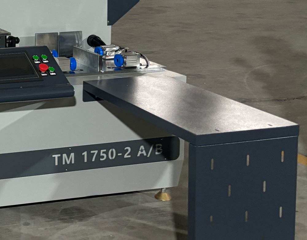 Фрезерный станок ЧПУ QUADRO ALUMIL TM 1750-2 A/B для фрезеровки круглых отверстий, пазов, снятия фасок, выемок под замки и петли, фрезерование сложных форм в профилях из алюминия и ПВХ. В конструкции два шпинделя, пневмоповоротная ось и дополнительный стол обработки торцов.