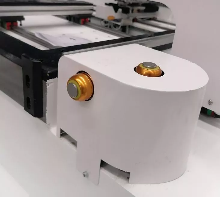 Модуль пробития с сервоприводом, позволяет делать V-образные насечки с заданными углом, а модуль «кисть» делает надпись чернильными стержнями или маркером, закрепленным в данный узел. Идеально подходит для раскроя рулонных материалов на мебельных производствах мягкой мебели, пошива одежды. Станок может работать с неткаными материалами — кожей, картоном.