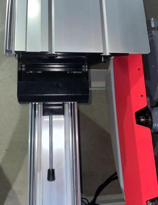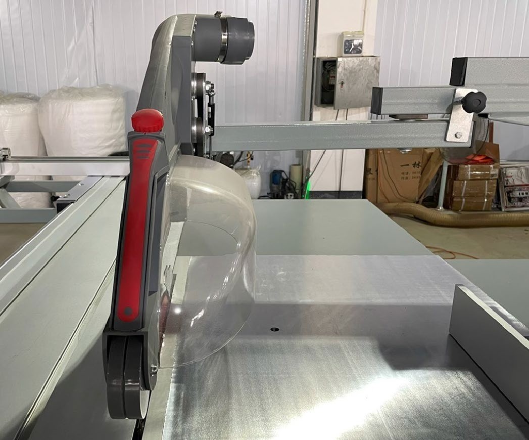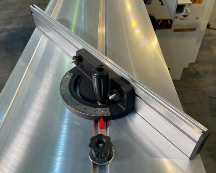 - Дополнительный рычаг роликовой каретки позволяет откатить ее в крайнее положение и заменить сразу две пилы. Сама роликовая каретка — надежная широкая, обеспечивает плавное движение и точный раскрой.