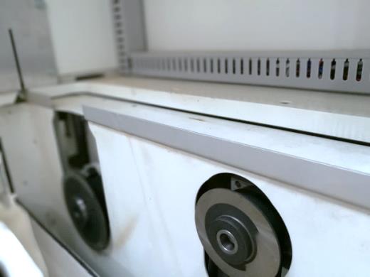 Два отдельных независимых привода на основную и подрезную пилы позволяют реализовать систему настройки вылета основной пилы в зависимости от толщины пакета раскраеваемых заготовок.